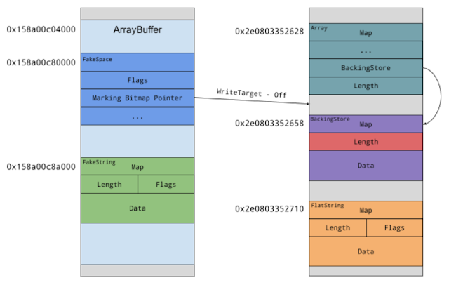 So what happens if the garbage collector kicks in while V8 is processing our fake string object? It will traverse all the live objects and mark them as such. For that, it’s starting with all globals, all objects currently on the stack and depending on the type of GC run optionally all objects in the old space that have pointers to the new space. Since our fake string object currently lives on the stack, the GC will try to mark it as live. To do so, it will mask off the lower bits of the pointer to find the space metadata, take a pointer to the marking bitmap and set the bit at the offset that corresponds to the offset of our object in the space. However, since the storage of our ArrayBuffer is not a V8 heap object and thus doesn’t live in a space itself, the metadata can live in user-controlled memory too. By setting the bitmap pointer to an arbitrary value, we gain a primitive to set a bit at any chosen address. The final memory layout will look roughly like this: